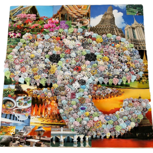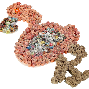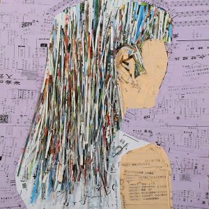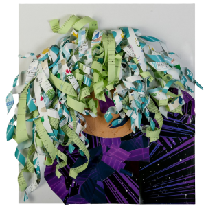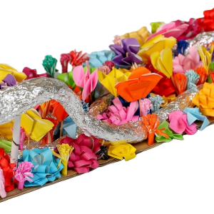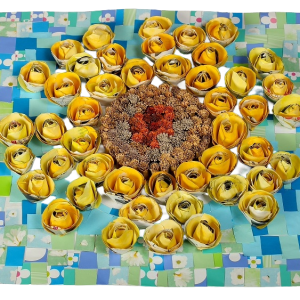 廃材(チラシ・ダンボール・新聞紙など)を使って作品を制作しています。家でも作品が作れるよう、身近にある素材を活用しています。お花や動物など自然をモチーフに、「日常に彩りが生まれるよう華やかに」 を意識して作っています。今回は新たな試みとして人物にも挑戦し、素材の新たな魅力を引き出すことを目指しました。