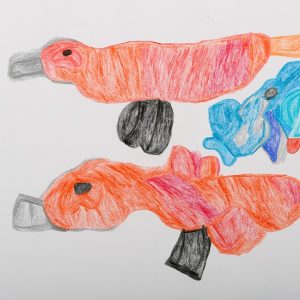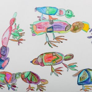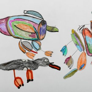 水鳥が大好きで、図鑑を見ながら一心に描いています。形と色使いが独特で、見ていてとても楽しくなります。