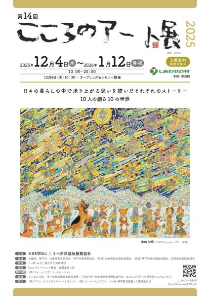 TOP / こころのアート展のあゆみ / 2025年度 こころのアート展のあゆみ2025年度 第14回こころのアート展 オープニング 本展の様子 開催期間2025年12月4日(木)~2026年1月12日(月・祝)人数など応募者:124名/選出作者:10名選出作者荒木佑仁/大岡竜征/木嶋智信/中畑寿康/From R/堀之内健治/溝口啓一郎/八木まさゑ/山本祥太郎/yukari 併催イベント・巡回展など イベント●こころがそまるミニライブ巡回展その他取り組み●神戸旧居留地プロジェクト●ギャラリートーク(手話通訳付き)●サンポチカギャラリー●神戸リハビリテーション病院展示 こころがそまるミニライブ こころがそまるミニライブ 神戸旧居留地プロジェクト Prev